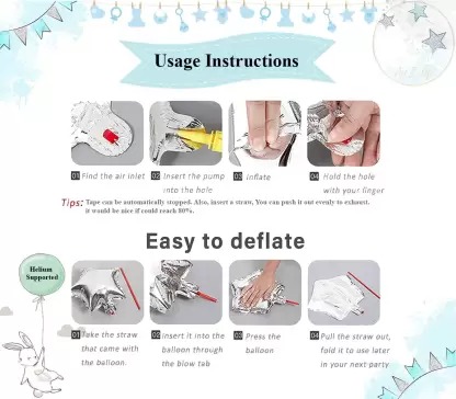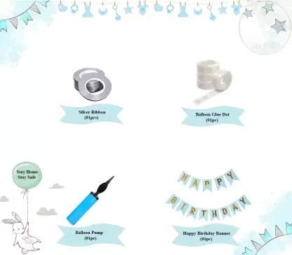 This 64 Pcs DIY Kit includes Blue Pastel Balloons (30Pcs), Grey Pastel Balloon (20Pcs), Silver Confetti Balloon (4Pcs), Silver Star Foil Balloon 18inch (2Pcs), Silver Star Foil Balloon 10inch (4Pcs), HBD Blue Banner (1Set), Silver Ribbon (1Pc), Balloon Pump (1Pc), Glue Dot (1Pc)