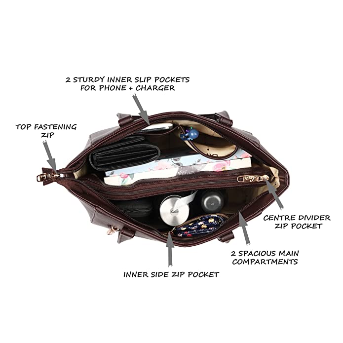 The main compartment is divided into 2 with a zippered divider pocket. It also has slip pockets alongside 1 zip pocket inside providing options for multiple storage. One should also not forget the zip pocket outside the bag.