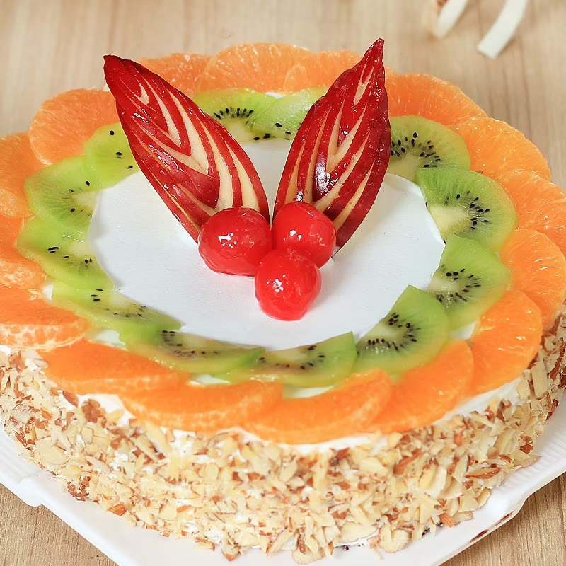 One fruit, two fruit, three fruit, four! Make them swirl in ecstasy and hit the scrumptious floor. This fruity delight is sure to make everyone go round and round in happiness with its tempting fruity flavor. Crowned with kiwis, oranges, apples, and cherries, this comes along with the gift of health with dry fruits embossed all over the edge.