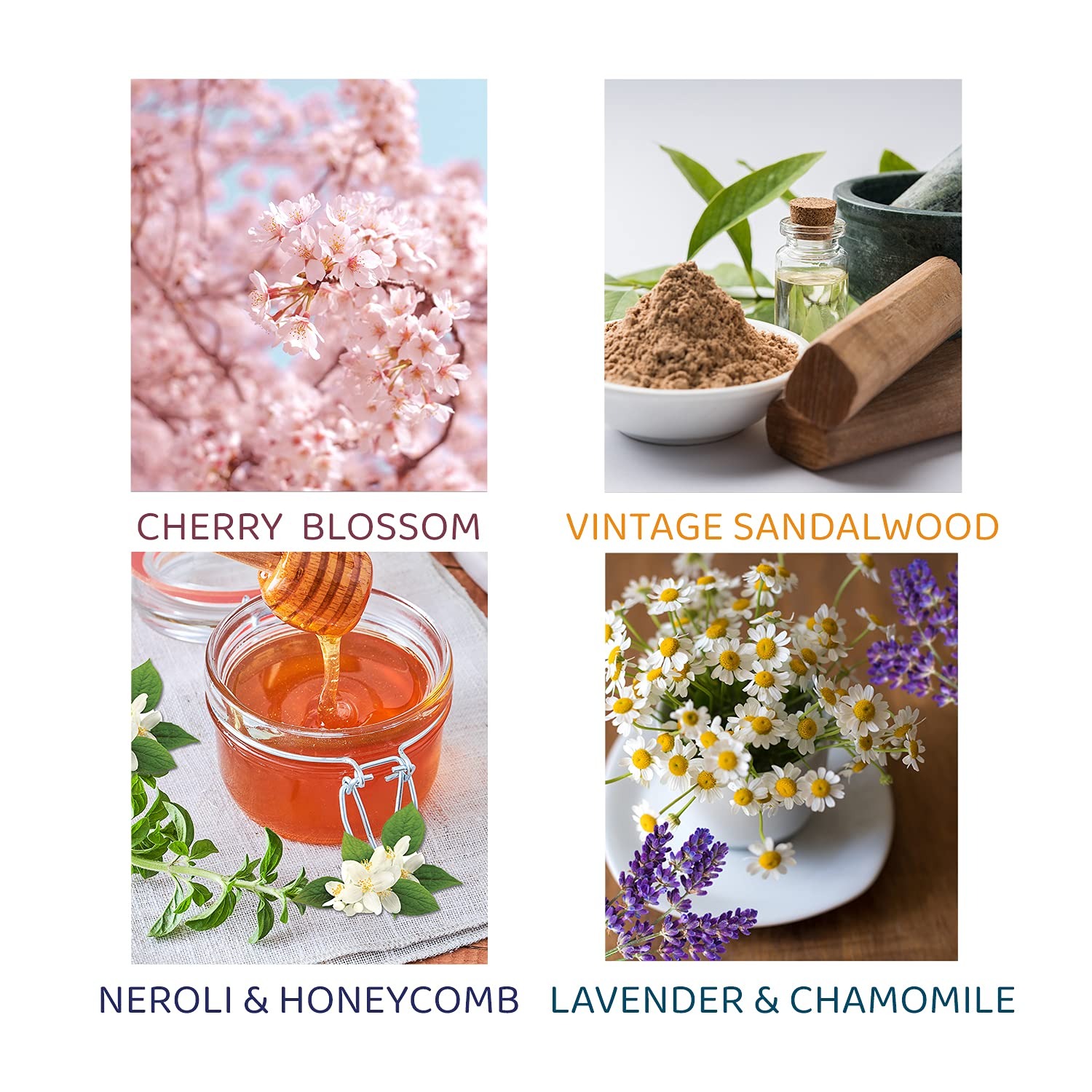 ✅Popular Fragrance: Scented candles gift set of 4 popular fragrances: Cherry Blossom, Vintage Sandalwood, Neroli & Honeycomb, and Lavender & Chamonile.