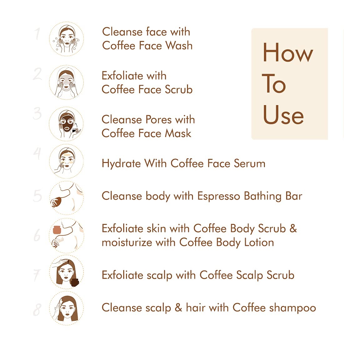 POWERFUL INGREDIENTS, GENDER NEUTRAL: Coffee deeply cleanse in Coffee Face Wash. Coffee Face Scrub has Coffee to exfoliate. Espresso Coffee Bathing Bar has Coffee to deeply cleanse. Coffee Body Scrub has Coffee & Coconut Oil to exfoliate, nourish. Coffee Powder, Natural AHA exfoliate in Coffee Scalp Scrub. Coffee Extract helps hair growth in Coffee Shampoo. Coffee Face Mask cleanses pores. Coffee Body Lotion tones the skin. Coffee Face Serum has hyaluronic acid to hydrate. Used by men & women.