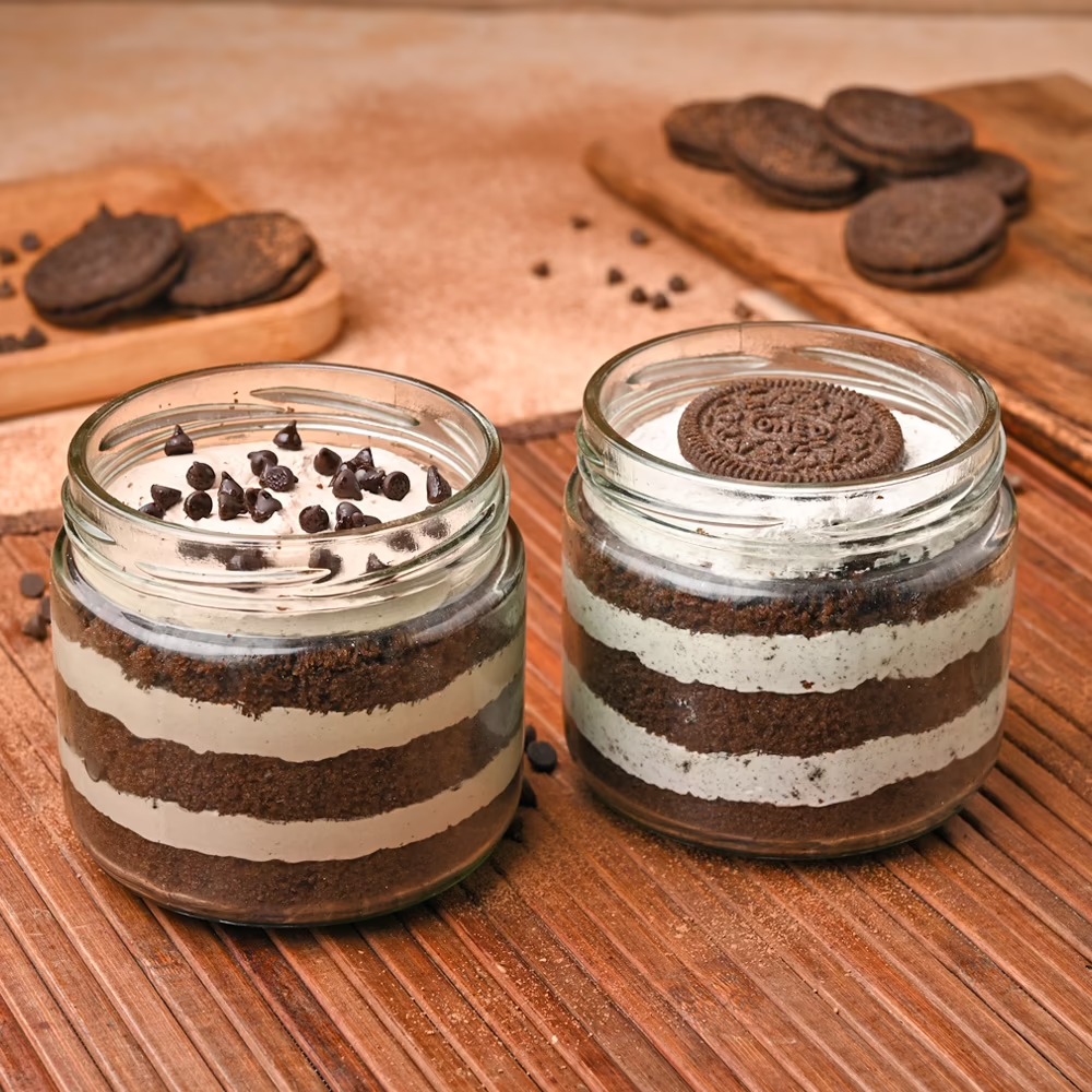 Product Description This is the combo to perfect to gratify your senses. With an amazing combo of choco chip and Oreo, these jar cakes are perfect for all chocolate addicts. This highly delectable combo includes one choco-chips jar cake and a mouth-watering Oreo Jar cake.