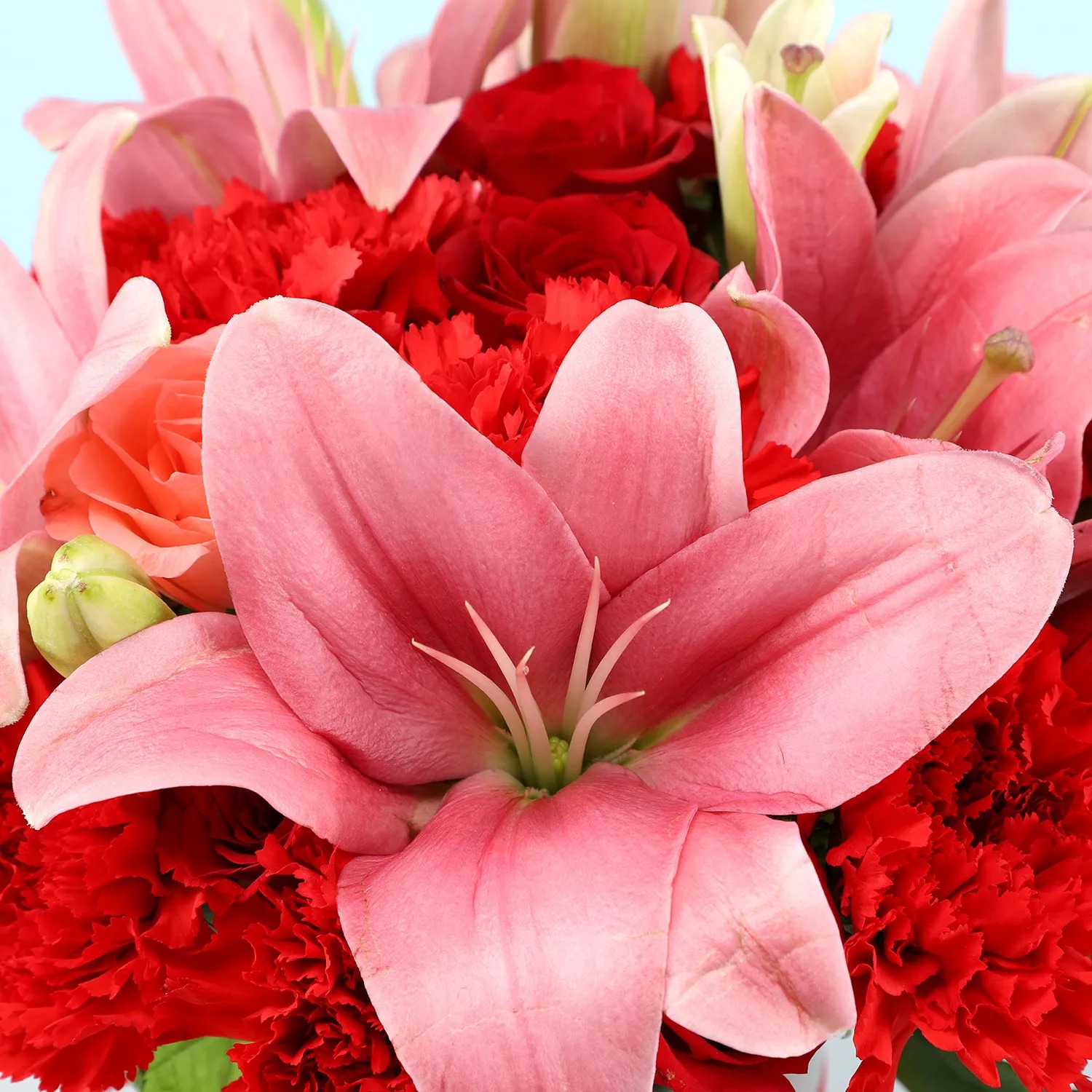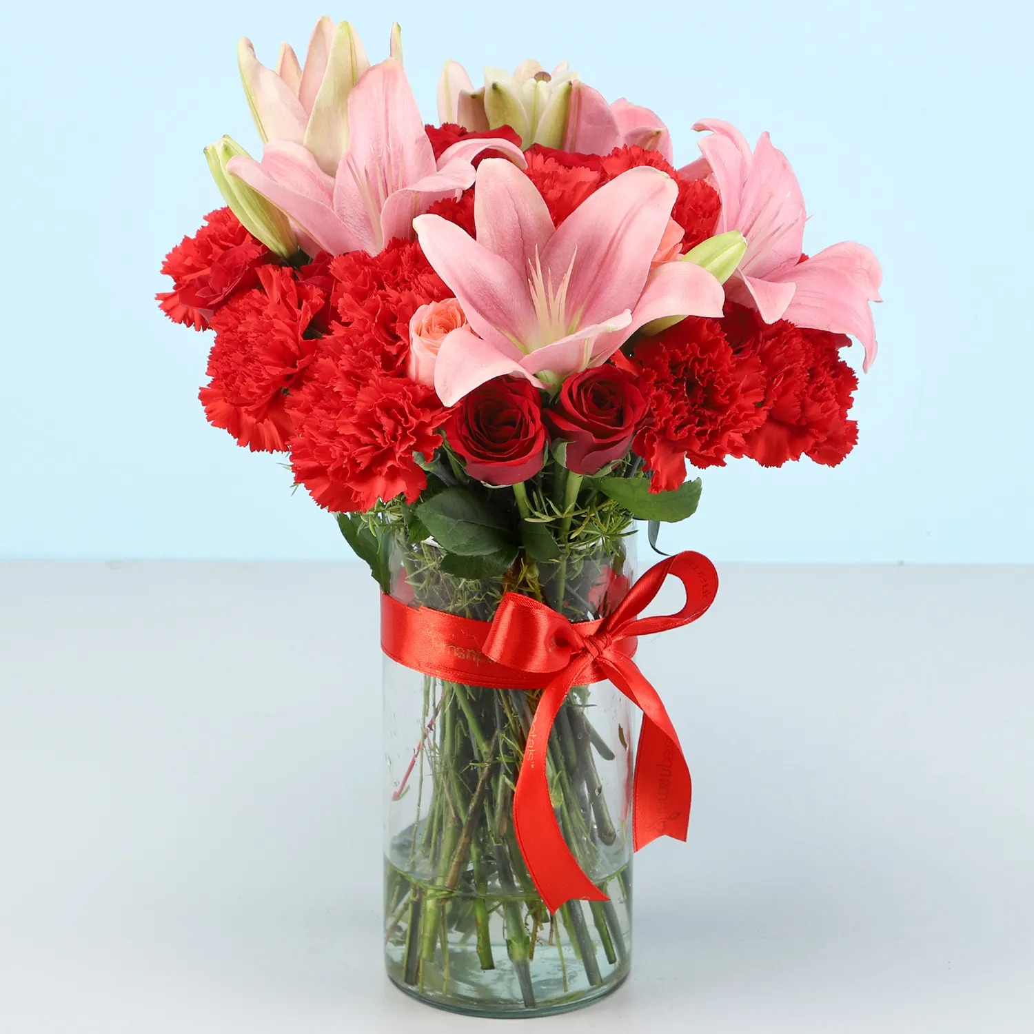 Description Product Details: 3 Pink Asiatic Lilies 5 Red Roses 5 Pink Roses 10 Red Carnations Cylindrical Glass Vase- 4 x 8 inches Decorated with FNP Red Ribbon Flower Trivia: Did you know that the rose is edible, can live for a very long time, has been mentioned in the bible, and is a great source of vitamin C? Asiatic lilies are grown for their nearly flawless, brilliantly colored flowers that can be up to 6 inches in diameter. Country of Origin: India