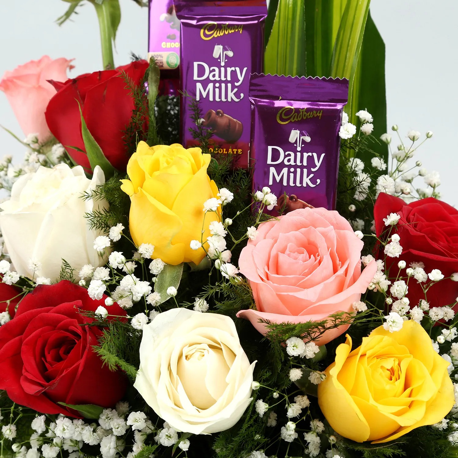 Description Product Details: 12 Mixed Roses 5 Dairy Milk Chocolates- 12.5 gms each Seasonal Fillers Cane Basket Flowers Trivia While everyone knows that red roses stand for true love & passion, they also signifies respect & appreciation. Did you know that the rose is edible, can live for a very long time, has been mentioned in the bible and is a great source of vitamin C?
