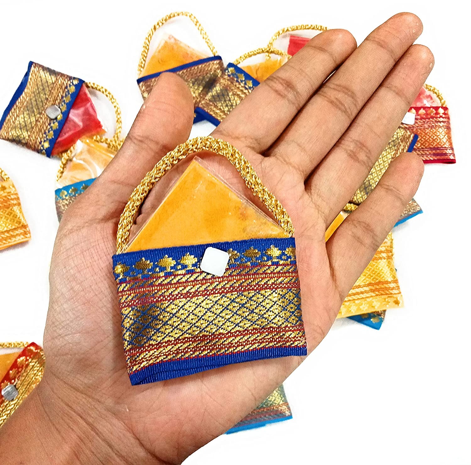 Cute pattu bags with haldi and kumkum 3*2.5 inches for all occasions for tamboolam return gift purposes or tamboolam pasupu kumkum purposes 3*2.5 inches bags